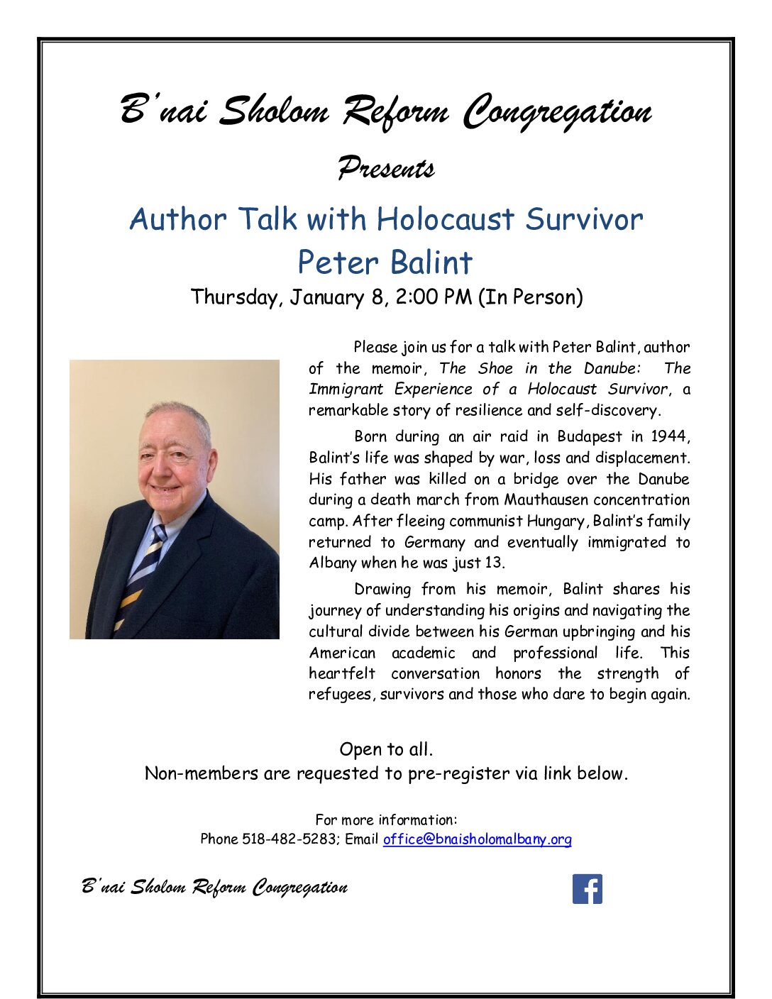 Please join us for a talk with Peter Balint, author of the memoir, The Shoe in the Danube: The Immigrant Experience of a Holocaust Survivor, a remarkable story of resilience and self-discovery.