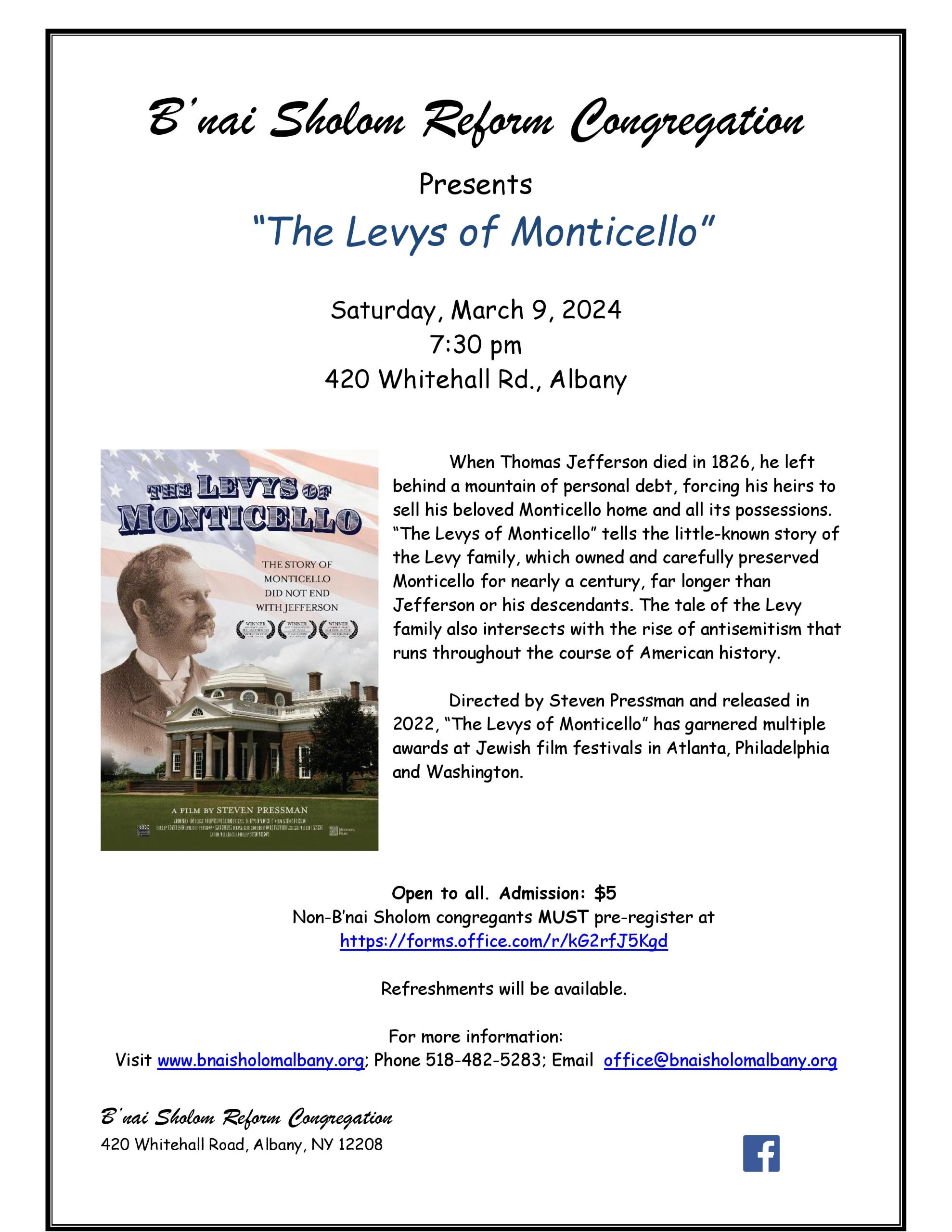 March 9, 2024 @ 7:30 pm – When Thomas Jefferson died in 1826, he left behind a mountain of personal debt, forcing his heirs to sell his beloved Monticello home and all its possessions. “The Levys of Monticello” tells the little-known story of the Levy family, which owned and carefully preserved Monticello for nearly a century, far longer than Jefferson or his […]